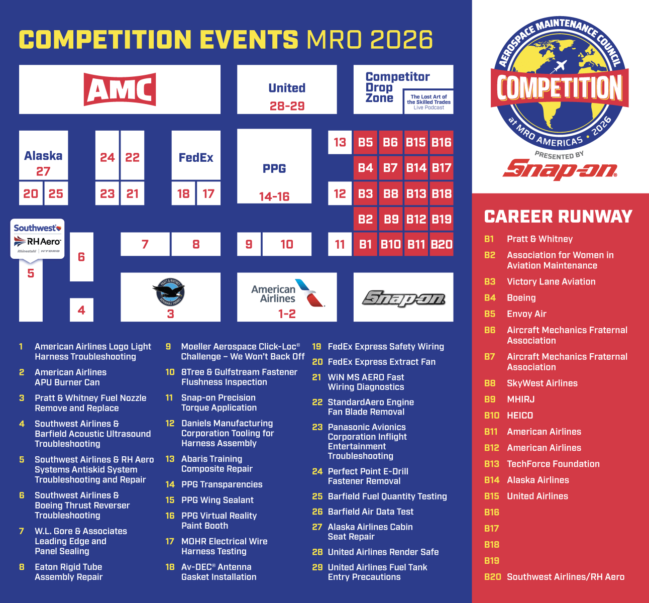 The 2026 AMC Competition @ MRO Americas takes place on the exhibition floor at Aviation Week Network's MRO Americas. Five-member teams will compete in maintenance events intended to test skill and knowledge required of an aviation maintenance technician.