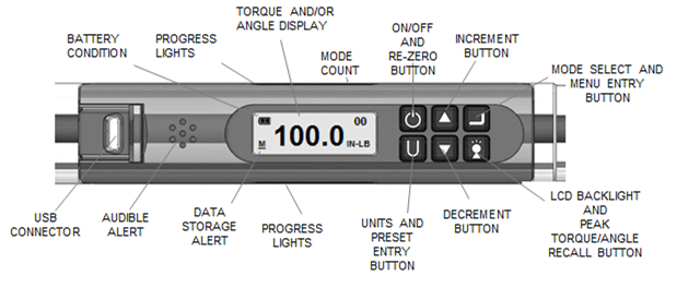 Grasp center of handle and slowly apply torque to fastener until progress lights display green and a ½ second audible alert and handle vibration alerts you to stop.