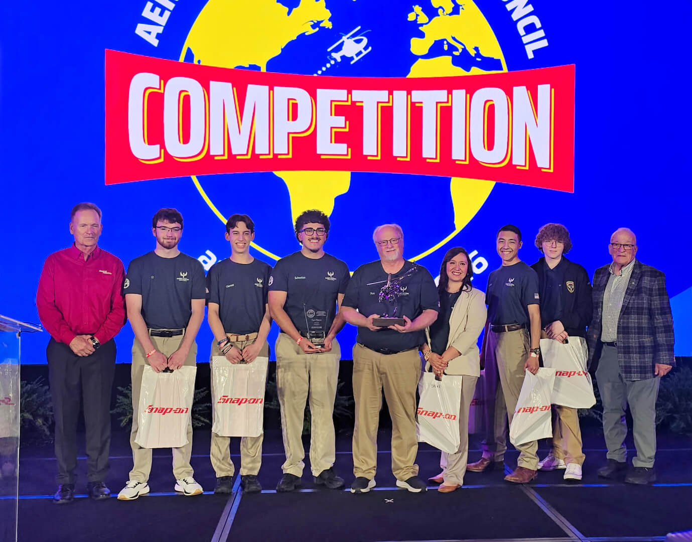 Scott Steward, Snap-on Industrial; Thomas (TJ) Wilson, Rising Aviation High School; Garrett Moore, Rising Aviation High School; Sebastian Rosas, Rising Aviation High School; Pete Miller, Aviation Maintenance and Technology Instructor at Rising Aviation High School; Kassy Dena, Rising Aviation High School; Jades Barraza, Rising Aviation High School; Preston Simms, Rising Aviation High School; John Goglia, Chairman, Aerospace Maintenance Council.
